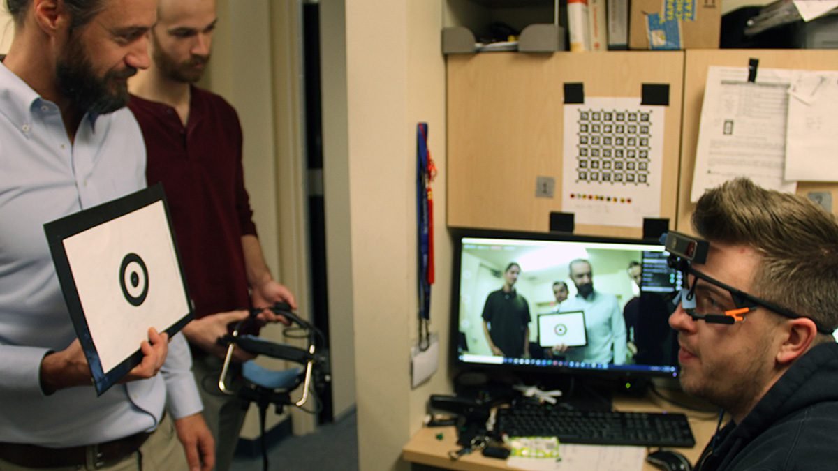 We wanted to use mini-computers, but they weren’t robust enough to handle our needs, so we ended up with a laptop in a backpack, it makes the headset a little more user-friendly so our subjects wouldn’t be distracted by the tech. We decided to go with a Pupil Labs product for the base and added devices to it. We didn’t want it to be too distracting for others, either.
